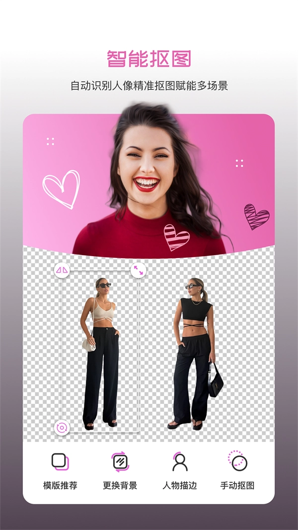 5、【智能抠像】:运用人工智能技术,实现全自动抠图。该功能可智能识别图片里的人像,哪怕仅用手机操作,也能获得完美的抠图效果。