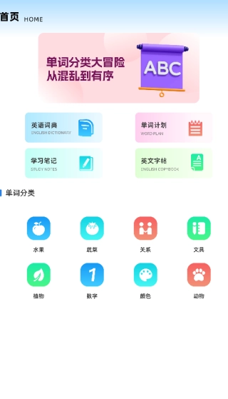 2. 单词类依据主题进行分类,每个单词均配备“卡通插画 + 标准发音 + 场景例句”。
