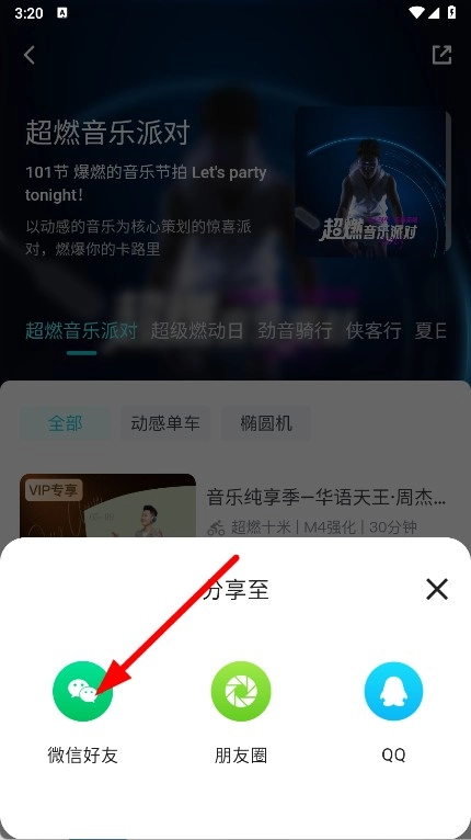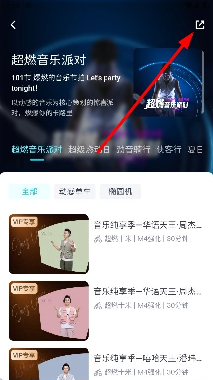 3、进入超燃音乐派对课程详情页后,点击页面右上角的分享图标,此时会弹出分享选项。