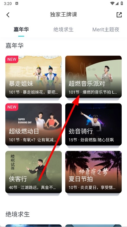 2、于独家王牌课列表页面,轻点超燃音乐派对课程卡片,即可进入该课程的详情页面。