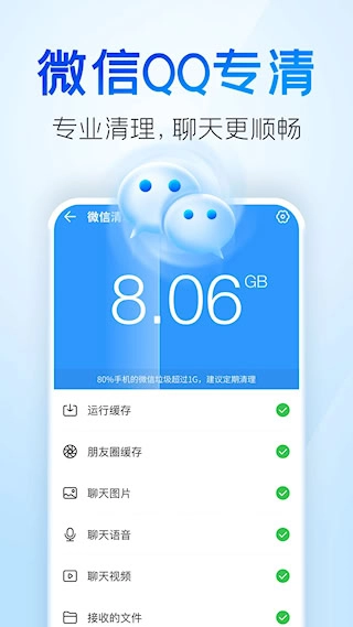 3、专项社交软件清理模块能够精准地识别聊天记录与媒体缓存,进而有针对性地释放存储空间。