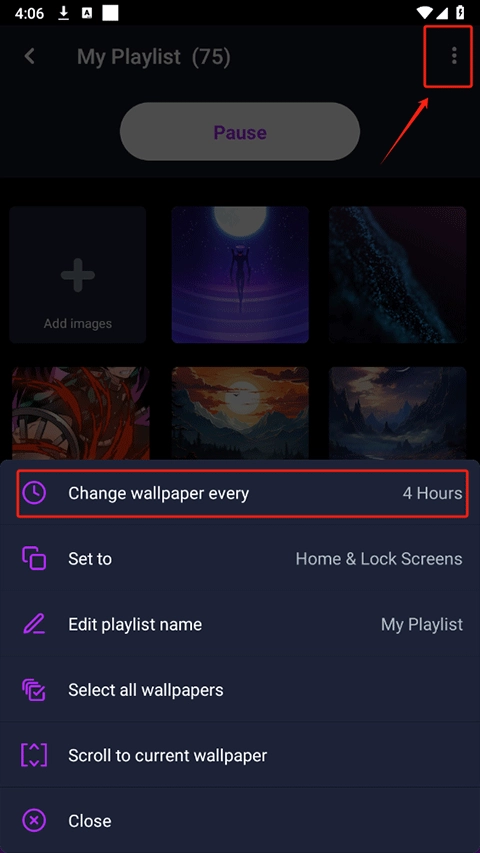 6、此外,点击右上角的三个点,你还能够对每次更换壁纸的时间进行自定义设置。