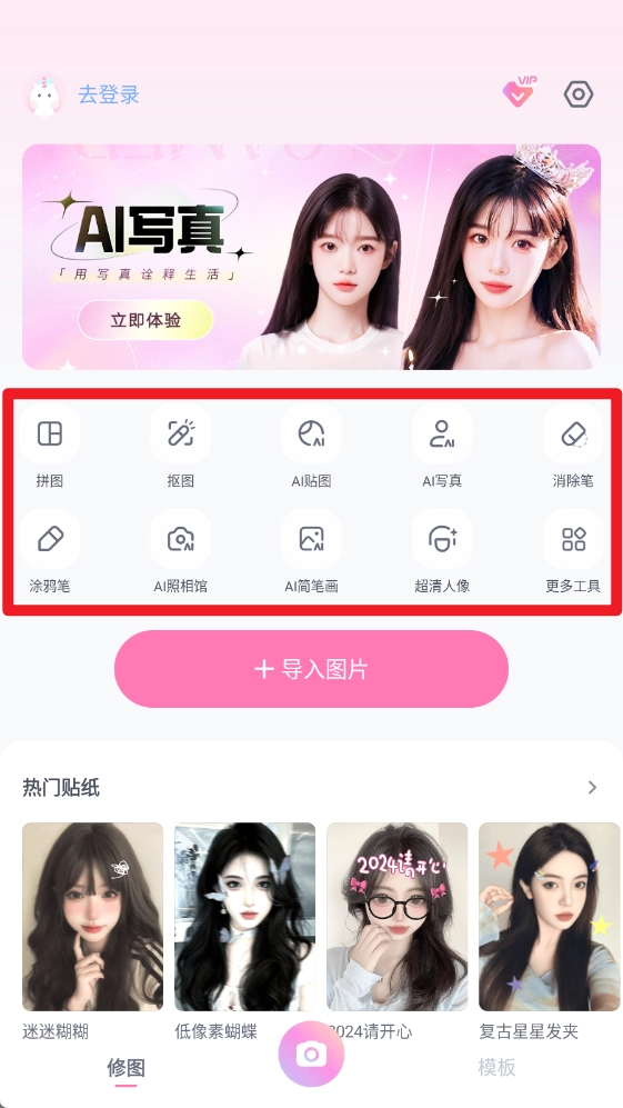 2. 进入首页之后,有拼图、抠图、AI 贴图、AI 写真等各类工具可供选择,无论是日常修图,还是追求创意玩法,不同需求都能得到满足。