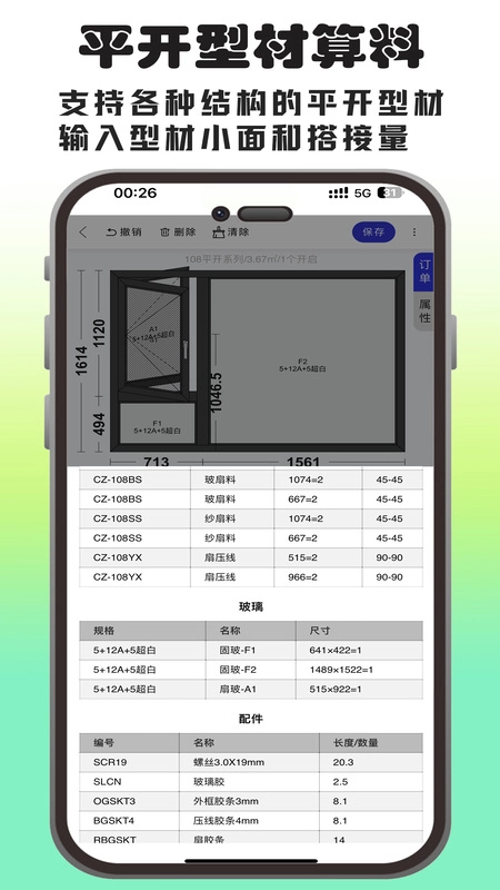 不仅如此,基于门窗型材结构,我们精心设计了一套门窗行业人员一看便知的计算方法。借助此方法,能够直接在手机上完成型材与玻璃的计算工作,同时实现型材优化,并生成门窗下料单、玻璃生产单以及型材优化单等相关单据。