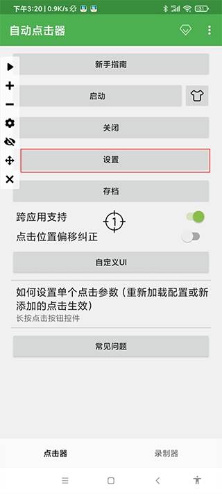 9、能看到旁边出现了一条功能悬浮框(包含开始暂停键、增加点击任务、增加滑屏任务、减少点击任务、隐藏任务点、关闭任务栏),接下来点击设置。