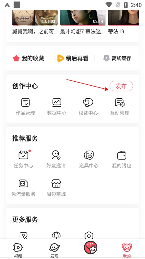 在【我的】页面的创作中心,点击【发布】,随后选择对应的投稿类型即可。