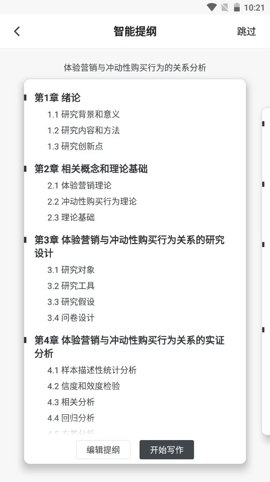 2、笔杆论文能够依据用户给出的标题,提供一个大致的纲要。若用户不想进行此步骤,也可点击右上角直接跳过。