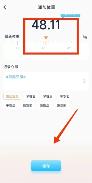 4、用户能够在添加体重页面输入自身的体重、心得等信息,点击保存按钮,就能成功保存记录。