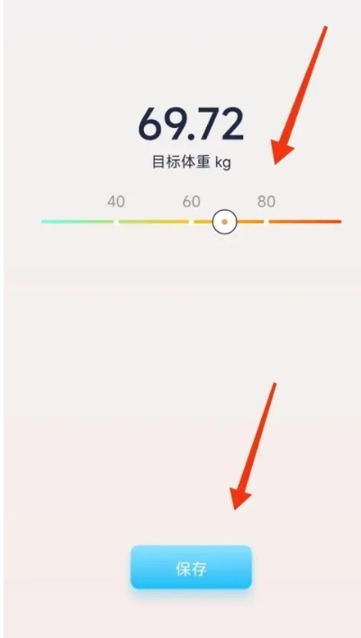 2、随后进入目标设置页面,拖动中间的【滑块】,将其调整至你期望的体重数值,之后点击【保存】。