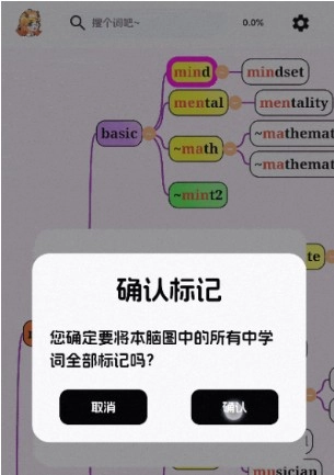 - 在学习进度页面,展开特定脑图,选中某个单词后,在弹出框的右上角通过标记按钮进行操作。