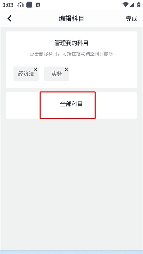 3、来到科目设置界面,选中全部相关科目,然后点击“完成”,就能开始使用了。