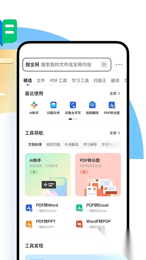 一站式快速处理办公文档、文件管理与学习资料;视频处理、格式转化、拍照扫描、文件解压缩等工具应有尽有。