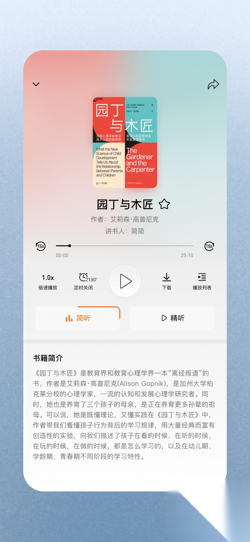 创新性地推出“简听”与“精听”双模式切换功能。其中,10分钟极简版聚焦核心观点,而40分钟精华版则呈现完整知识体系。