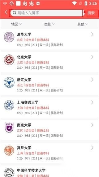 4、进入“找大学”页面后,可通过输入院校名称、专业等关键字来展开搜索。