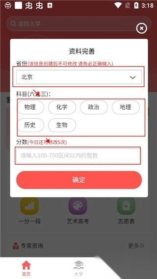 2. 补充完善个人资料,涵盖成绩、选科等相关信息,完成后点击 “确定” 进行保存。