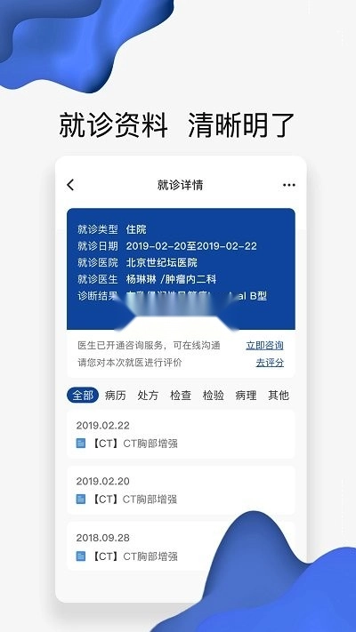- 用户在病历板块可查看各类就诊视图,涵盖急诊、住院、门诊、体检等相关资讯。