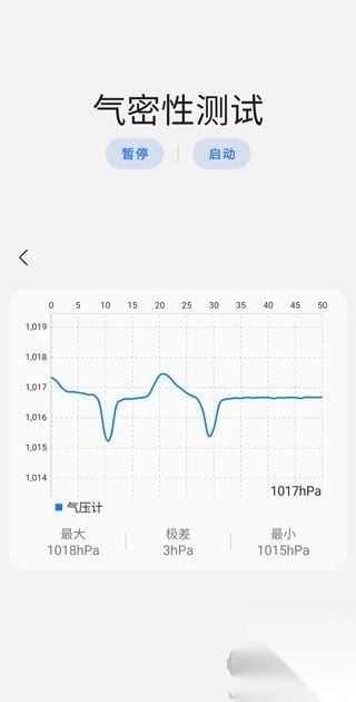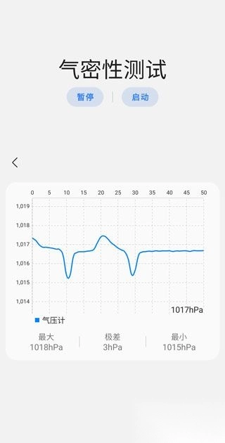 1. 气密性测试功能:具备测试暂停与启动的操作,能自动算出压力极差,并显示最大值和最小值。其入口可设置在主页或者关于手机的界面。