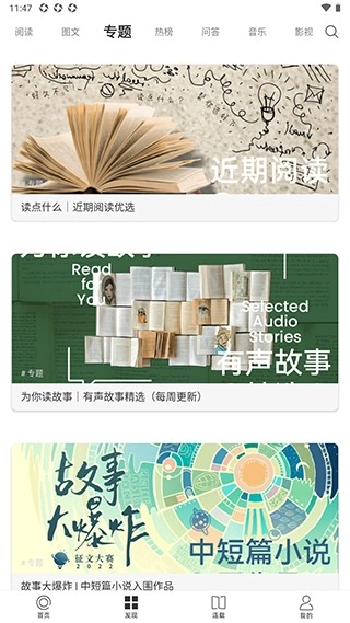 3、点开【发现】栏目,对多个专栏的内容进行浏览,其中涵盖阅读、图文、专题、热搜榜、问答、音乐以及影视等。