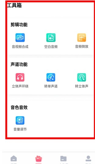 包含音频倒放、音量调整、音视频合成、环绕立体声等工具。