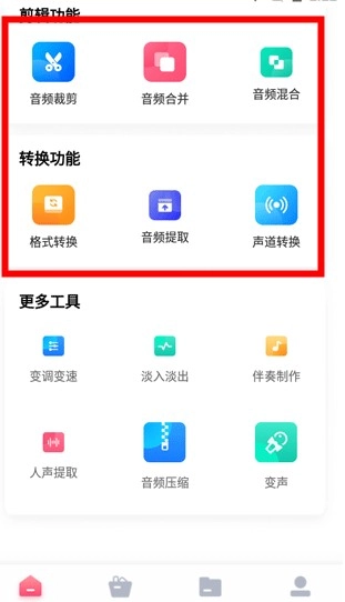 安装并打开软件,首页提供音频剪辑、格式转换、变调、伴奏制作等功能。