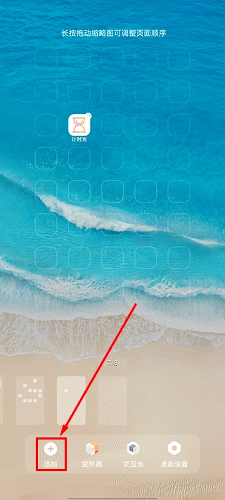1、打开手机设备的桌面,长按空白处,进入编辑页面后,点击“添加”新增桌面组件。