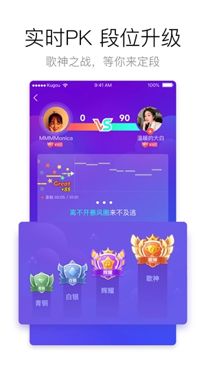 2、用户能够在该平台上与其他人进行PK,由观众评判谁的声音更为动听。