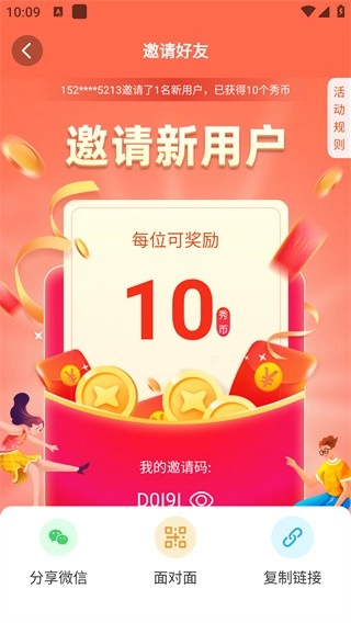 用户可通过晓秀“我的个人中心”的banner、首页精选视频页面的红包图标等入口,进入邀请好友活动页面。进入后,可通过[分享微信]、[面对面]、[复制链接]这些入口分享链接,若新用户通过该链接注册使用晓秀,老用户就能获得奖励。