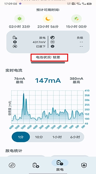 3、此外,你也能够在“放电”页面查看电池状态以及实时电流输出情况。