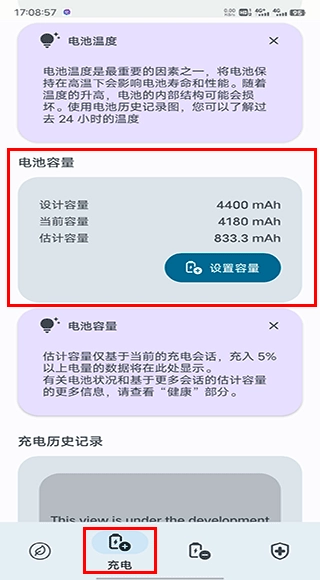 2、在下方菜单栏中点击“充电”按钮进入,在当前页面向下滑动,找到电池容量选项,即可查看电池的出厂容量以及预估容量(即电池寿命)。