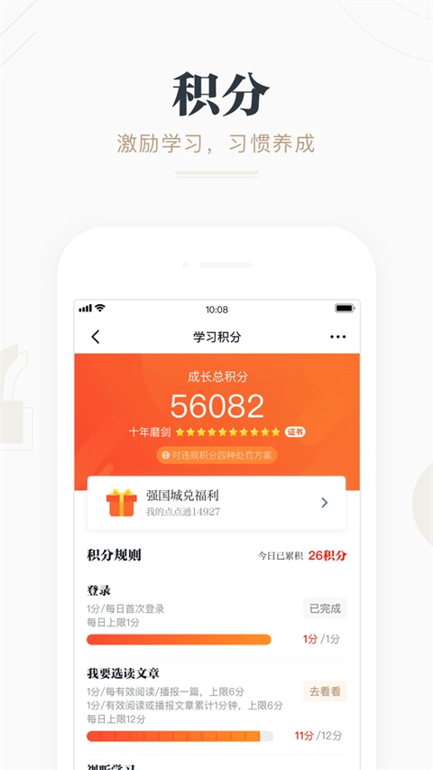 学有所获、学有所用。每日登录、浏览资讯、学习知识、挑战答题、收藏分享,每一种学习行为都会获得积分。