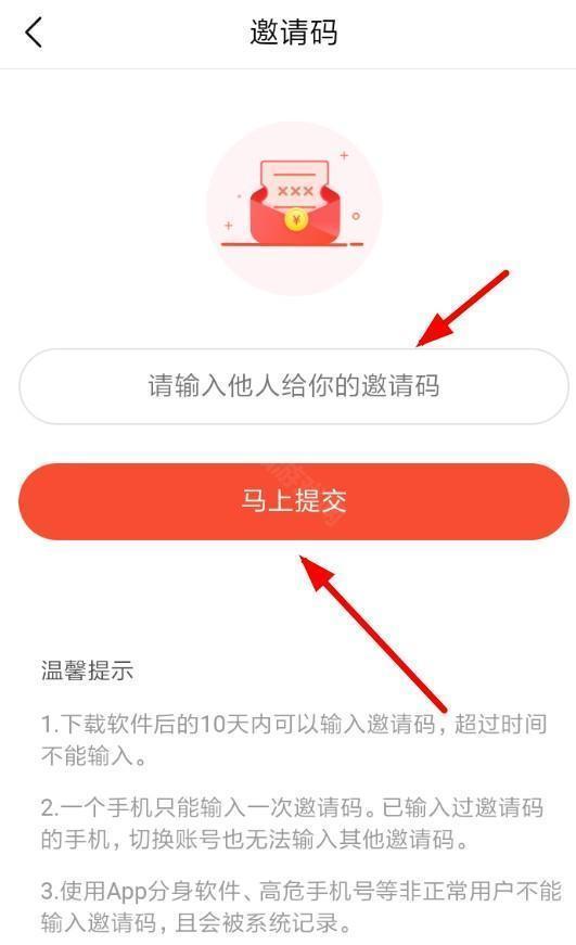2、当进入输入邀请码的页面后,填入他人提供的邀请码并提交,即可成功领取1元红包。