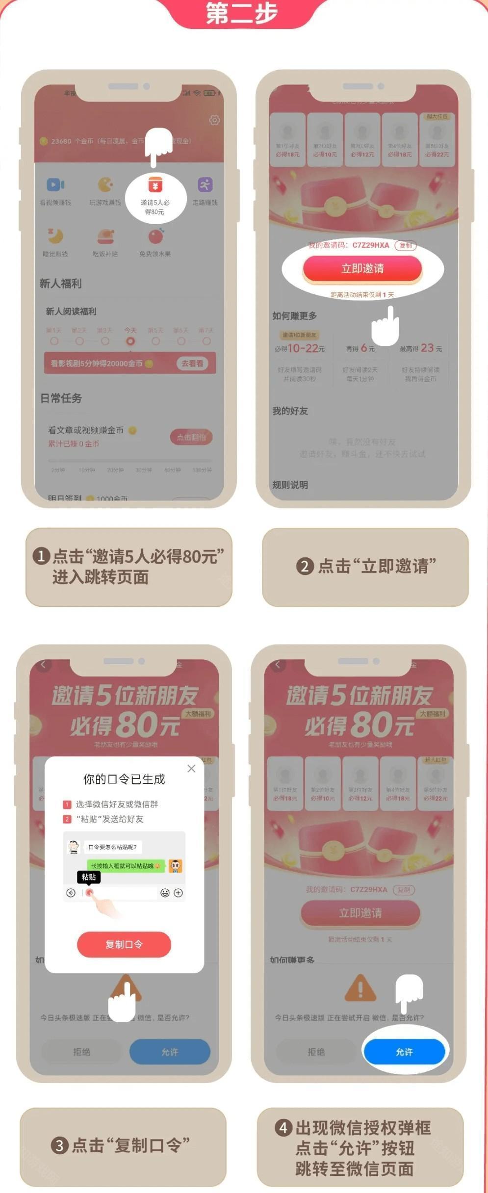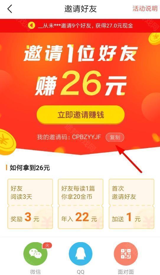 3、要是您对此感兴趣,还能利用“邀请好友”功能,复制自己的邀请码。当其他人注册今日头条极速版并填写您的邀请码后,您就能获取现金收益啦!