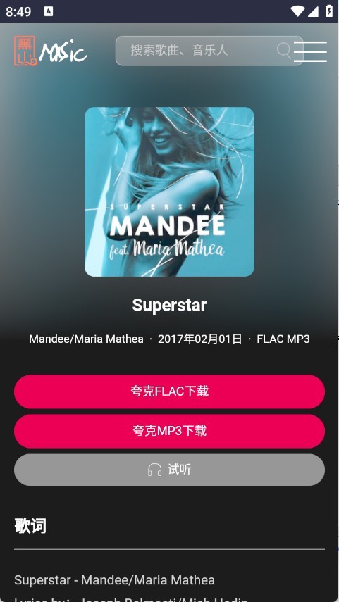 支持通过歌名、歌手、专辑、歌词等多种关键词进行搜索,能迅速锁定目标音乐。