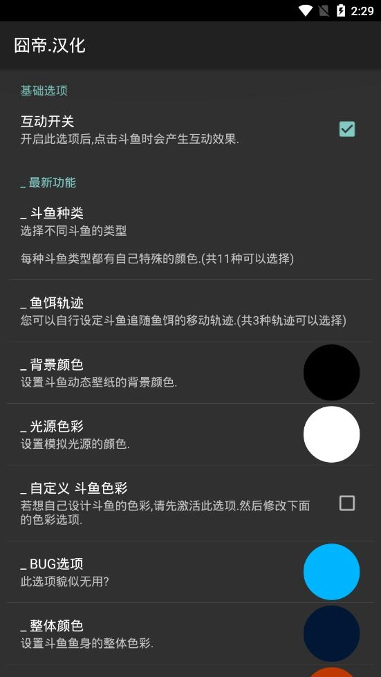 斗鱼提供了丰富的自定义选项,用户可以根据个人喜好设置斗鱼的种类、鱼饵轨迹、背景颜色、光源色彩等。此外,软件还支持鱼饵开关、镜头距离、斗鱼种类更换间隔以及手机动画帧数的调整。这些功能不仅让用户能够打造独一无二的动态壁纸,还能根据手机性能进行优化,确保流畅的视觉效果。