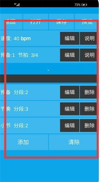3、点击对应功能进入设置页面,在此页面上,针对速度、预备节拍等参数,还有各分段内容,借助编辑、删除、添加、清除等按钮来进行调整配置,以完成个性化设置。