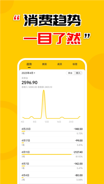 消费趋势:借助清晰直观的图表,能助你迅速剖析消费状况,明确资金的去向。