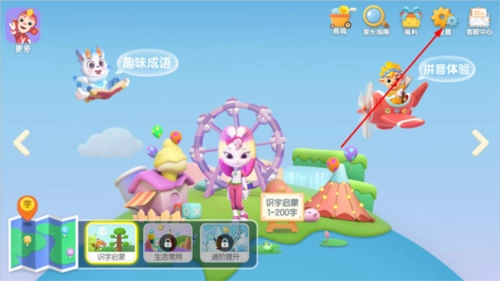 1在洪恩识字的主页面,点击右上角的设置选项,随后进行验证操作。