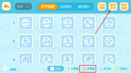 3、来到字库界面,在上方挑选宝宝学习的栏目类别,下方能看到红色标注的“未掌握”字。要是想学习之前没掌握的字,点击“难字歼灭”就能开始学习。