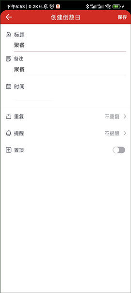 2、接着填好标题、备注以及时间,把重复次数、提醒和置顶设置妥当后,点击右上角的保存按钮。