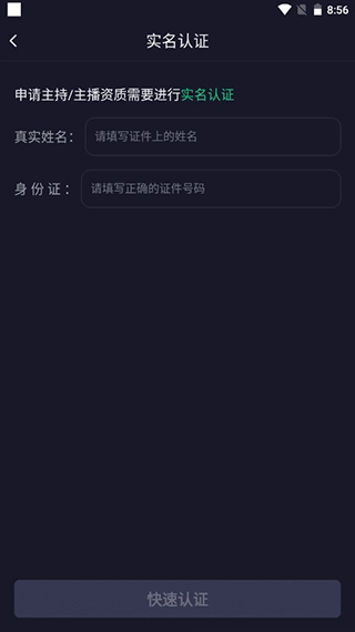 4、当用户完成实名认证后,系统会向用户询问是否申请主持/主播资质。需要注意的是,唯有取得该资质的用户,才有权限在平台上开设聊天房。