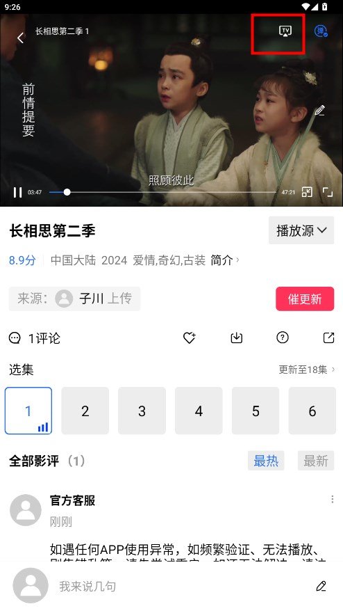2. 挑选心仪的影视剧开始播放,在播放界面,能直接看到投屏及相关功能。