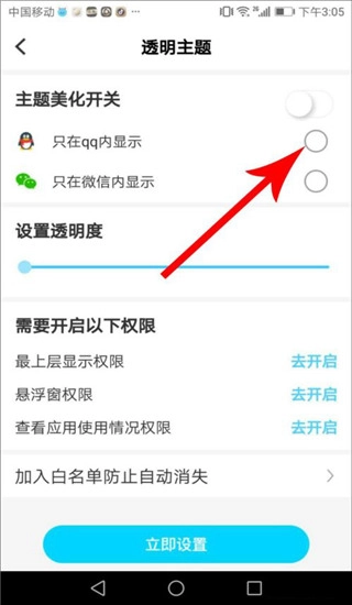 3、我们要制作的是qq主题,故而在“主题美化开关”一项中,点击“只在qq每显示”右侧的锁定按钮