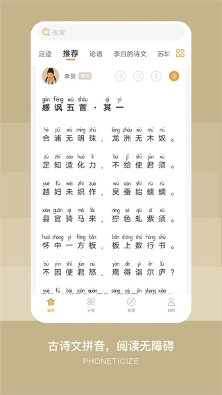 古文岛为广大用户准备了丰富海量的古诗词内容以及各类学习资料。用户在该平台上,只需轻松一键,就能开启搜索之旅。同时,平台还支持古诗词原文的线上朗读功能,并且提供详细的拼音注释,方便用户学习。若您对此感兴趣,不妨在本站的软件中体验一番。