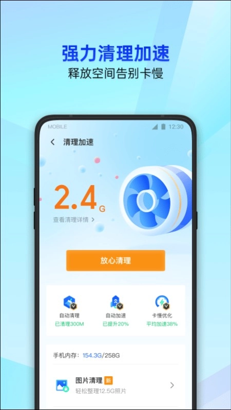 2、强劲清洁力,手机清洁功能卓越,高效释放手机空间,使用过程中始终流畅,绝无卡顿。