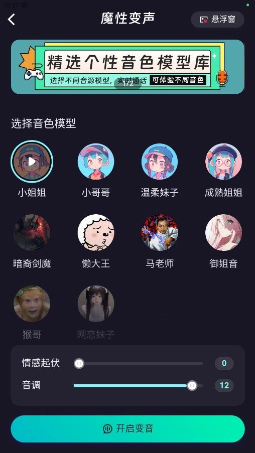 选择音色模型,开启变音,即可变声
