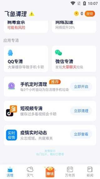 1. 下载并安装飞鱼清理大师软件,待成功进入该软件界面,即可看到诸如一键清理、一键加速之类的功能。