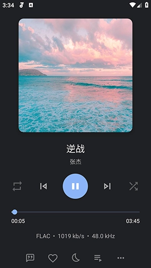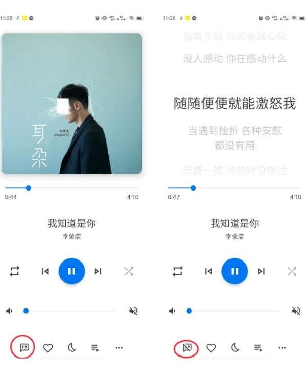 点击播放界面下方的歌词按钮就会显示滚动歌词,再次点击可以回到专辑封面