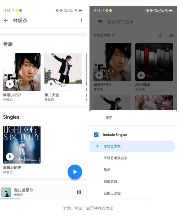 点进一个歌手的详细界面,可以看到专辑和单曲是分开放的。并且在专辑菜单中可以设置不显示单曲。
