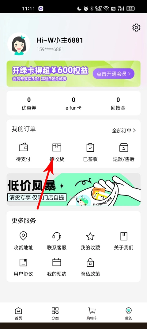 1、点击来到我的页面之后,找到头像下方的e-fun卡,点击进入;