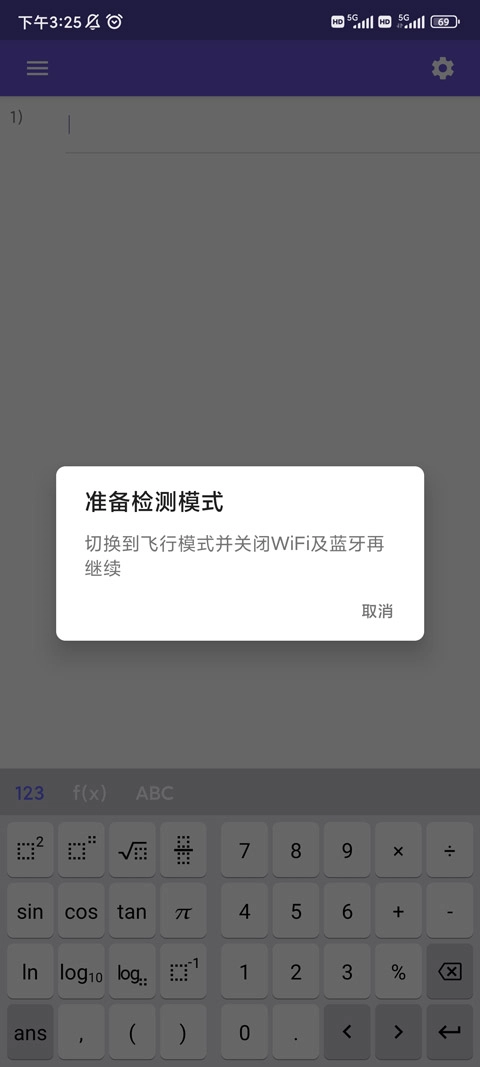 弹出的对话框提示您需切换至飞行模式。开启飞行模式后,手机便无法接收或发送外界信号。如此一来,能确保您的设备已锁定为科学计算器检测模式,且在取消飞行模式之前,不允许访问任何其他内容。